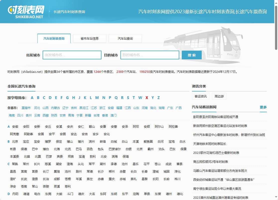长途汽车时刻表网是您查询年全国汽车时刻表的权威平台,提供全面的客车时刻表、票价信息、汽车站位置、线路时刻表查询服务,并支持在线预订汽车票。我们覆盖全国各大市县区,确保用户能够便捷地获取最新的汽车出行信息。无论是计划长途旅行还是短途出行,长途汽车时刻表网都能为您提供详尽的汽车时刻和票价数据,助您轻松规划行程。
